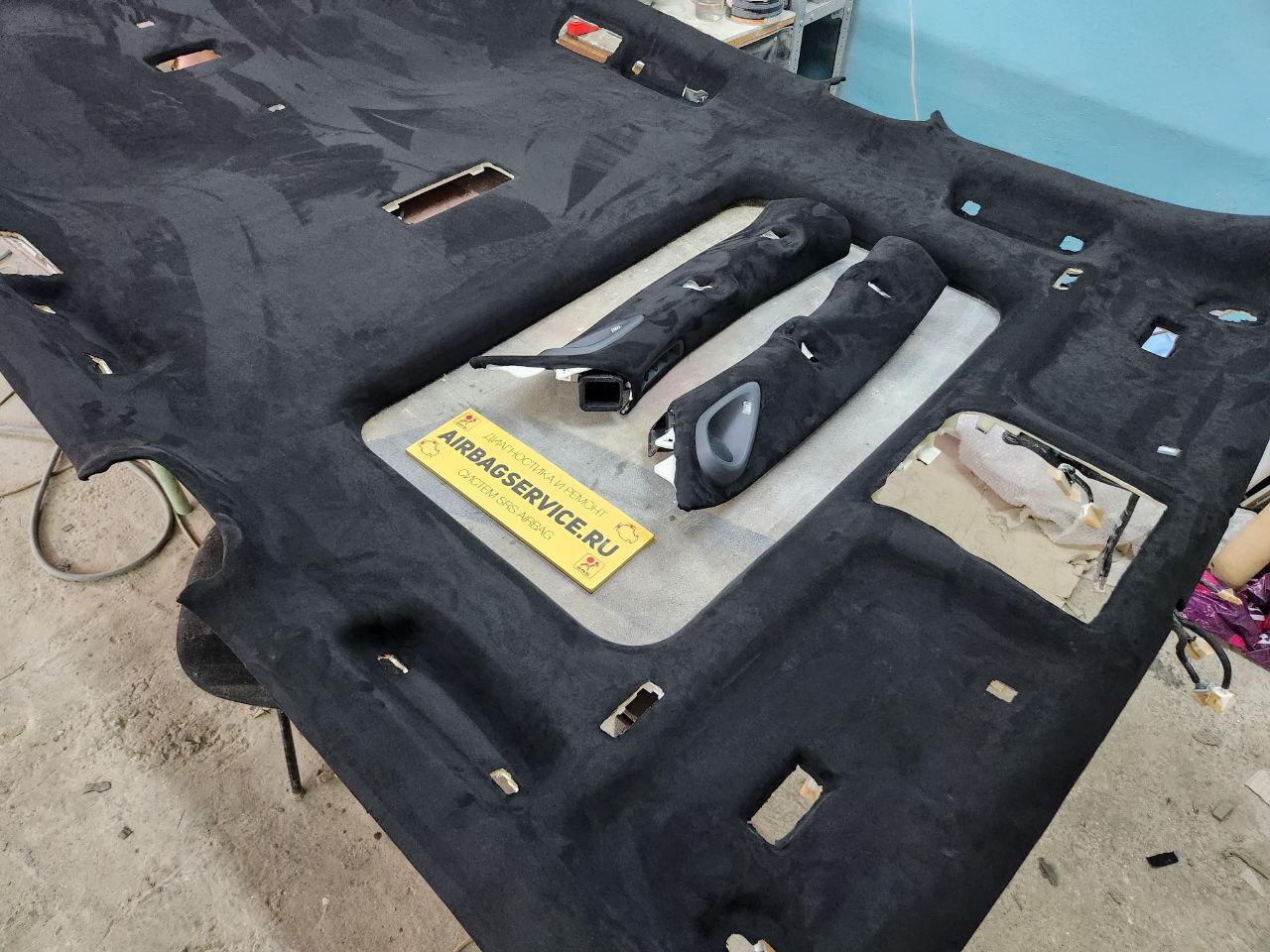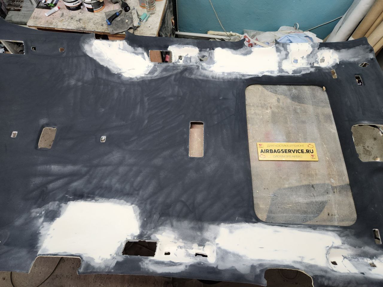 При срабатывании шторок безопасности, зачастую повреждает потолок автомобиля. Чтобы заломы и трещины на потолке не было видно, мы полностью перетягиваем потолок, цвет и текстуру подбираем как у оригинала. Место разрыва со стороны крыши укрепляется специальной эпоксидной смолой, а со стороны салона - мягкой шпатлевкой. Таким образом, трещины и повреждения устраняются, а после перетяжки потолок выглядит как новый.