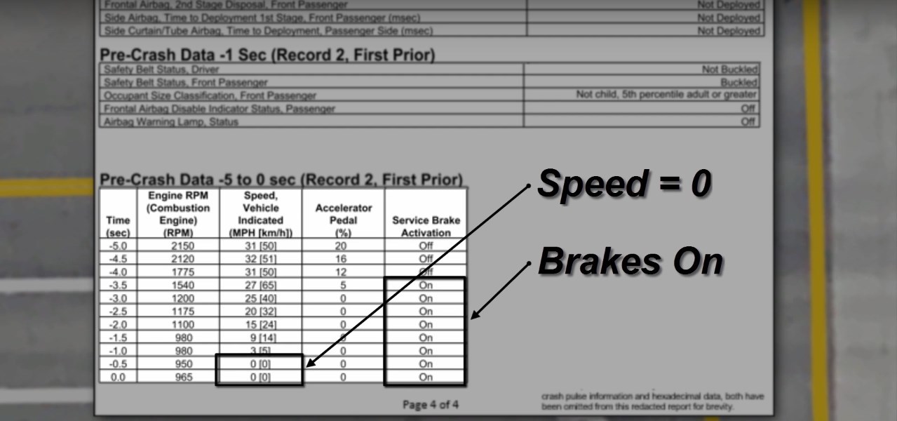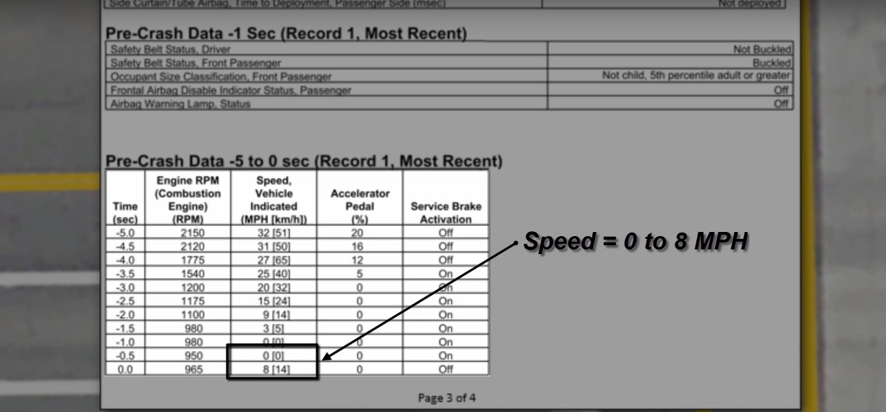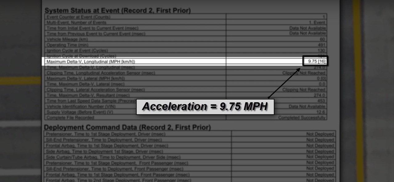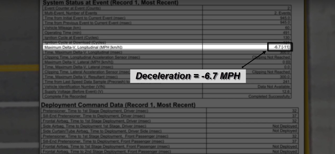 Это включает в себя время/дату, скорость транспортного средства, delta-v (показатели замедления/ускорения автомобиля), положение педали тормоза, давление в системе ABS, положение педали акселератора, состояние ремня безопасности, угол рулевого управления, а также многие другие важные параметры данных, записанные транспортным средством.